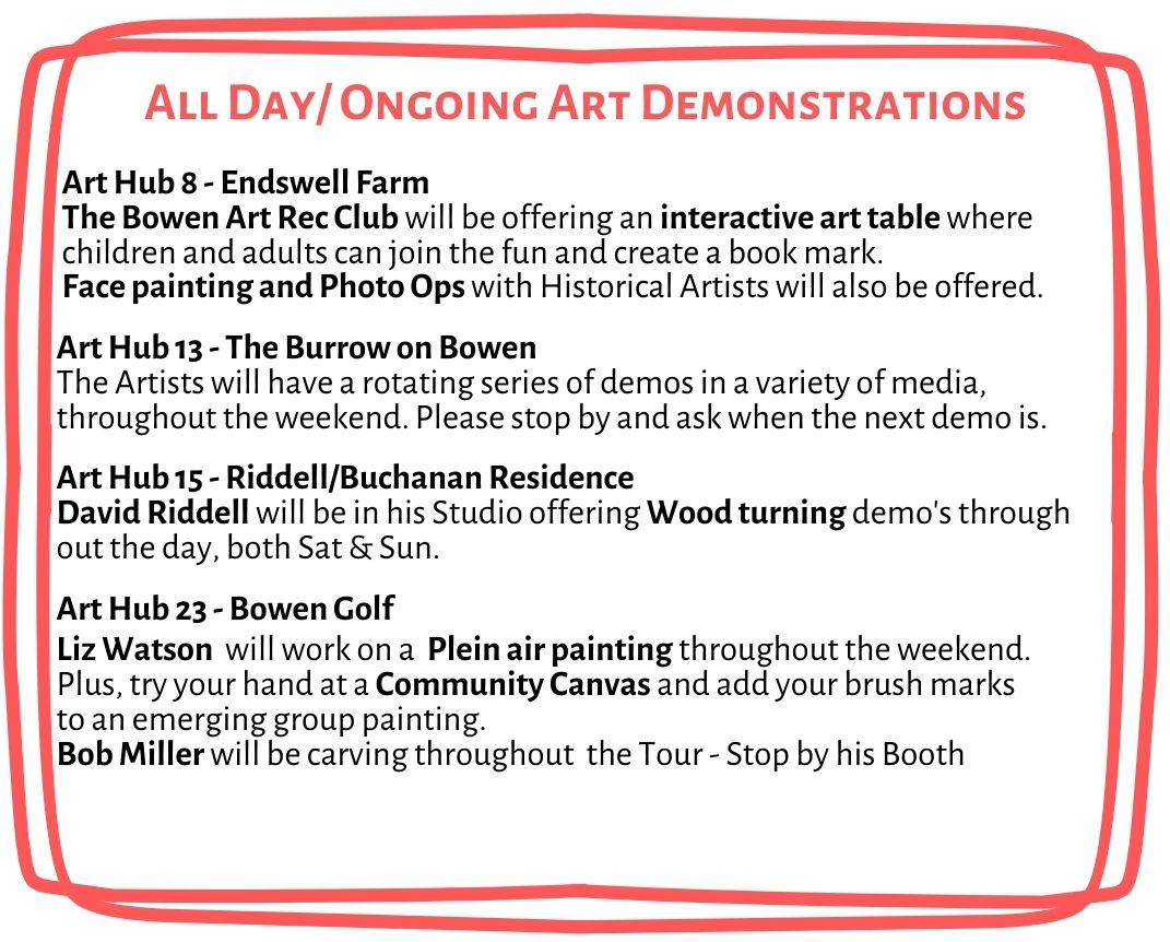 Join the Bowen Art Rec Club , Artists at the Burrow, David Riddell, Bob Miller and Liz Watson as they create during the 2 day Tour.