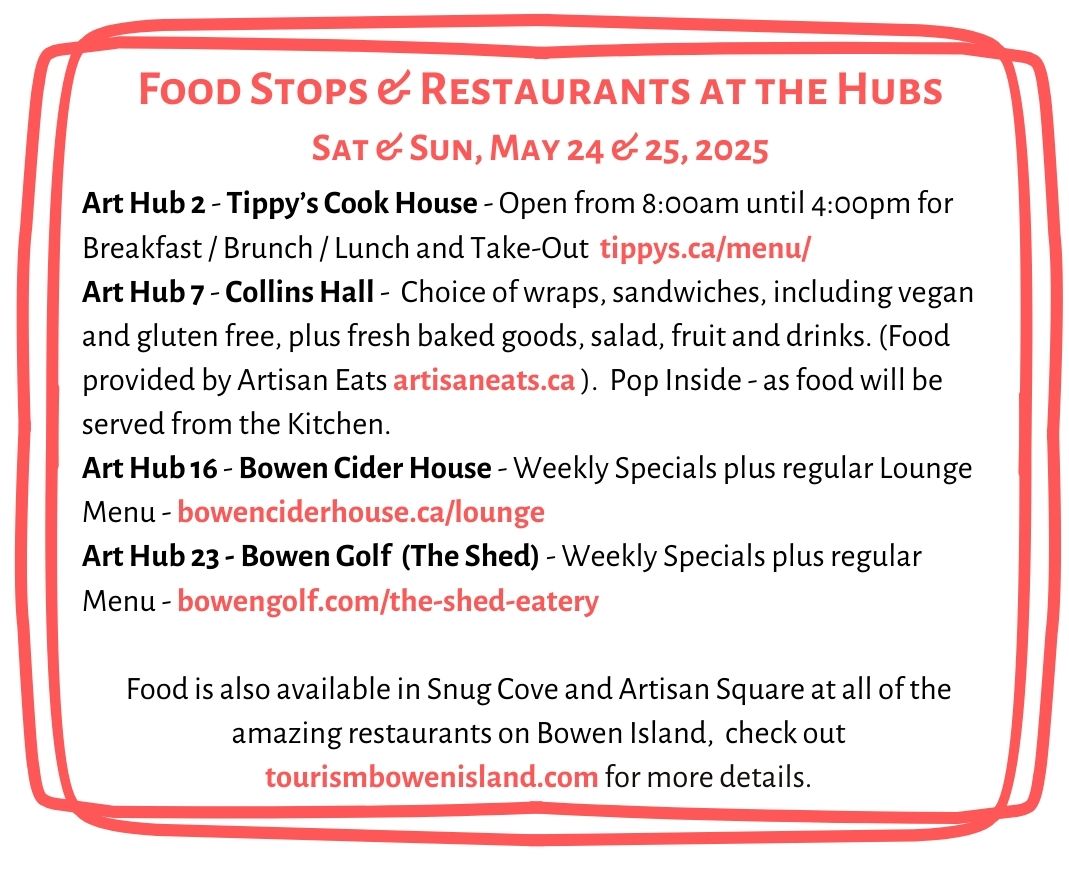 Collins Hall (Art Hub 7), Tippy's Cookhouse (Art Hub 2), Bowen Cider House (Art Hub 16) and Bowen Golf (Art Hub 23) offer Food... Enjoy World Class Cuisine! Find Other Amazing Restaurants at tourismbowenisland.com